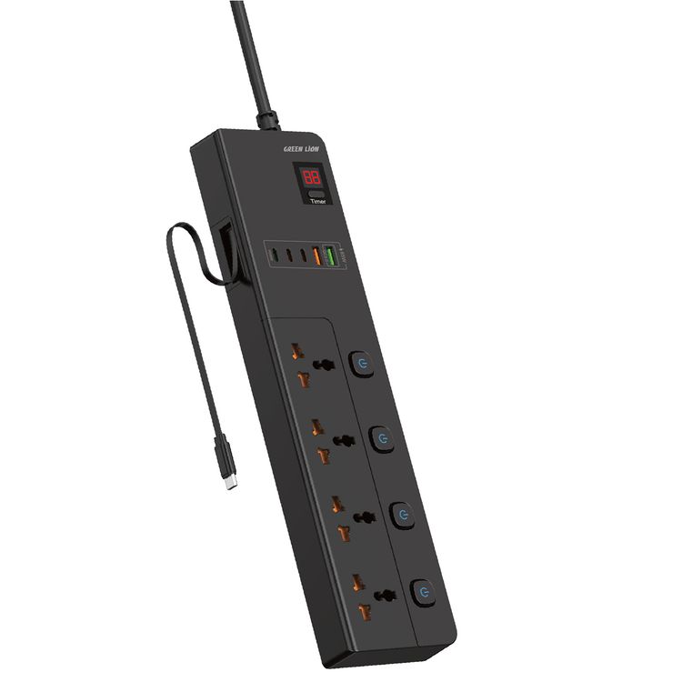 مقبس طاقة Green Lion GS-800 بطول 2 متر وقوة 3500 واط، مصنوع من مادة البولي كربونات المقاومة للحريق، 4 مقابس تيار متردد، 2 منفذ USB-A، 3 منافذ USB-C، منافذ توصيل بريطانية، باب أمان للأطفال، شاشة عرض رقمية للمؤقت - أسود