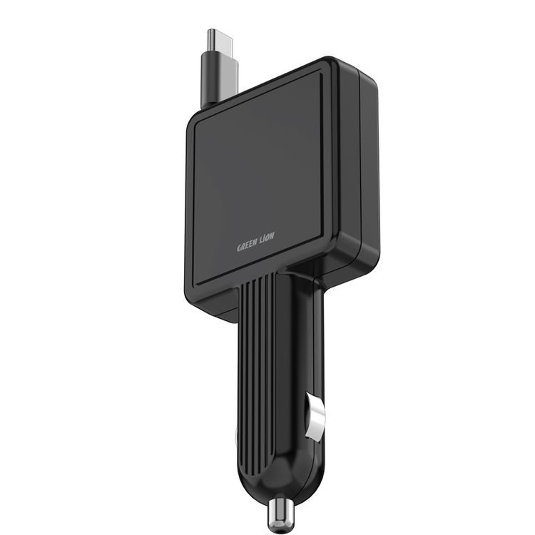 شاحن سيارة Green Lion قابل للسحب بقوة 30 وات، كابل شحن تلسكوبي، شحن سريع، كابل فيوز مدمج - أسود