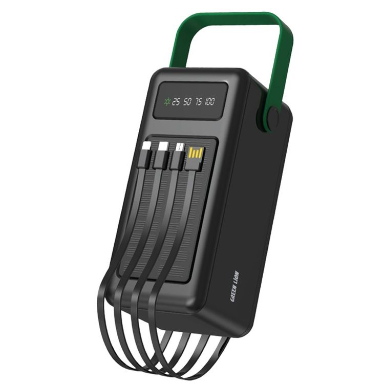 باور بانك Green Lion Solar Max بسعة 80000 مللي أمبير في الساعة مع شاشة رقمية ولوحة شحن تعمل بالطاقة الشمسية ومخرج Type-C/Micro/Lightening/USB-A وخفيف الوزن وقابل للحمل و4 كابلات مدمجة - أسود