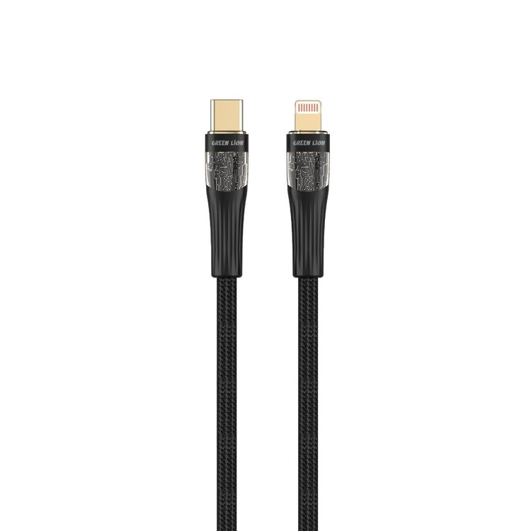 كابل جرين ليون شفاف USB-C إلى Lightning مع ضوء LED، شحن سريع ومزامنة، 18W، توافق واسع، آمن وموثوق - أسود
