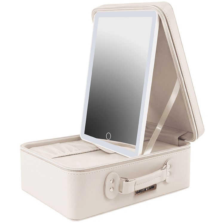 حقيبة مكياج للسفر من Green Lion مع مرآة مضيئة مع سطوع قابل للتعديل، وإغلاق بسحاب، وتحكم باللمس، ووقت عمل لمدة ساعتين، و28 حبة LED، وبطارية 1500 مللي أمبير في الساعة - بيج