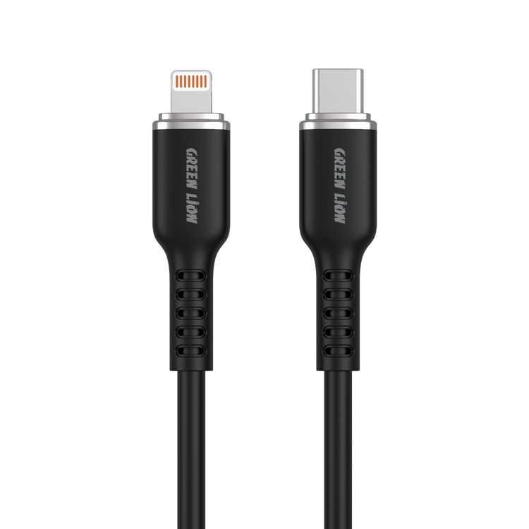 كابل سيليكون USB-C إلى Lightning بطول 1 متر من Green Lion، سرعة نقل 480 ميجابت في الثانية، 18 وات، شحن ومزامنة، عمر افتراضي يزيد عن 10000 ثنية، آمن ومضمون - أسود