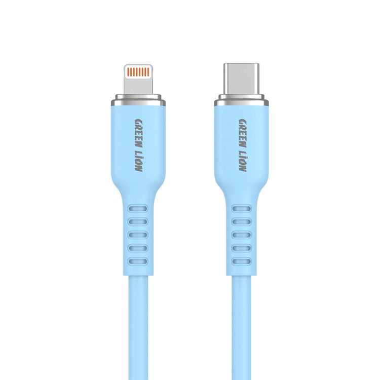 كابل سيليكون USB-C إلى Lightning بطول 1 متر من Green Lion، سرعة نقل 480 ميجابت في الثانية، 18 وات، شحن ومزامنة، عمر افتراضي يزيد عن 10000 ثنية، آمن ومضمون - أزرق
