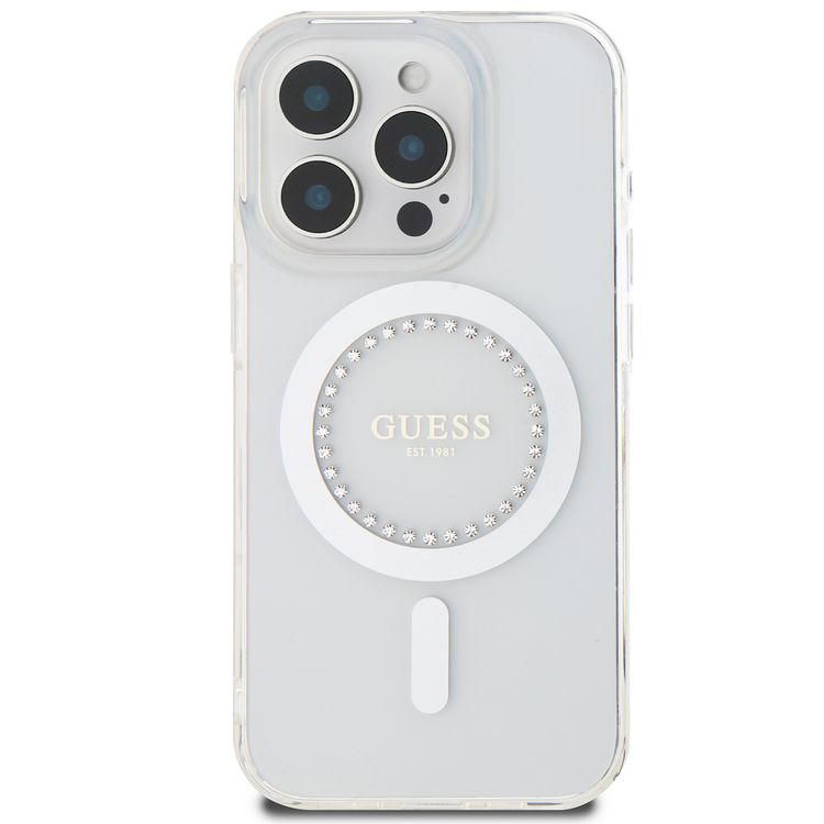 غطاء GUESS MagSafe IML الصلب بتصميم أحجار الراين لآيفون 16 برو، سهل التركيب، مقاومة للسقوط، نحيف - أبيض