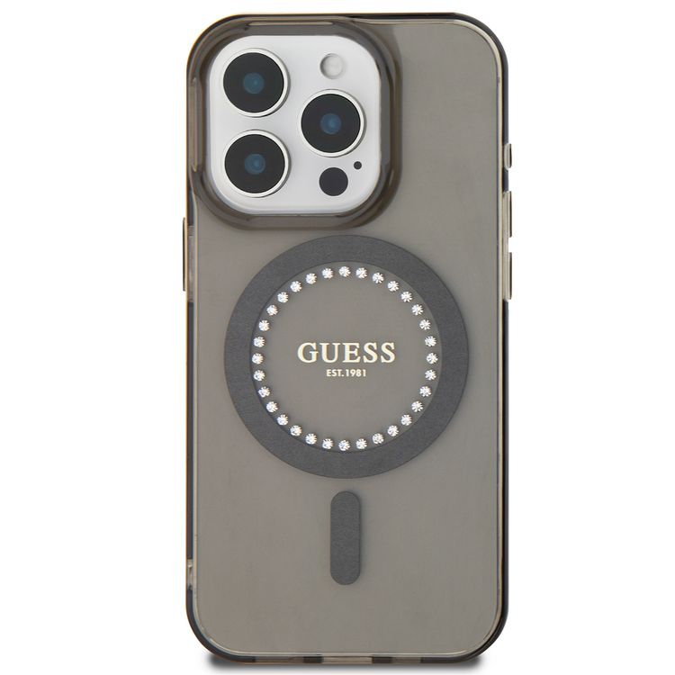 غطاء GUESS MagSafe IML صلب بتصميم أحجار الراين لهاتف iPhone 16 Pro Max، سهل التثبيت، حماية من السقوط، بروفايل نحيف - أسود