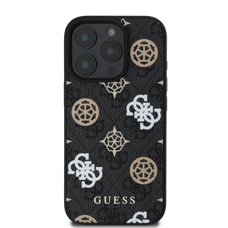 جراب Guess PU 4G صلب بتصميم زهرة الفاوانيا لهاتف iPhone 16 Pro Max، سهل التركيب، تصميم سهل الانزلاق - أسود