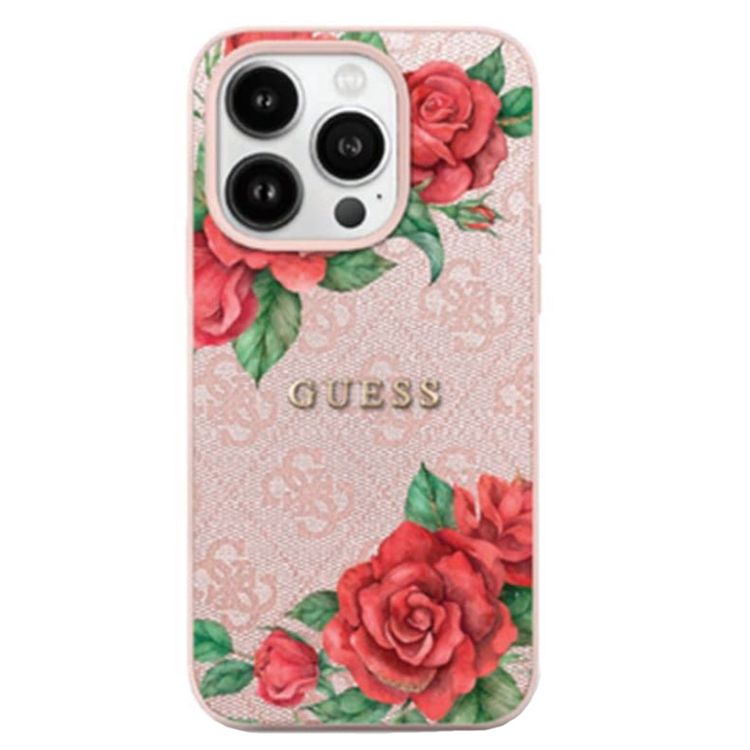 كفر Guess PU 4G الصلب بتصميم Roses Metal لهاتف iPhone 16 Pro Max سهل التركيب ومع قبضة آمنة ومريحة وحافة كاميرا مرتفع - وردي