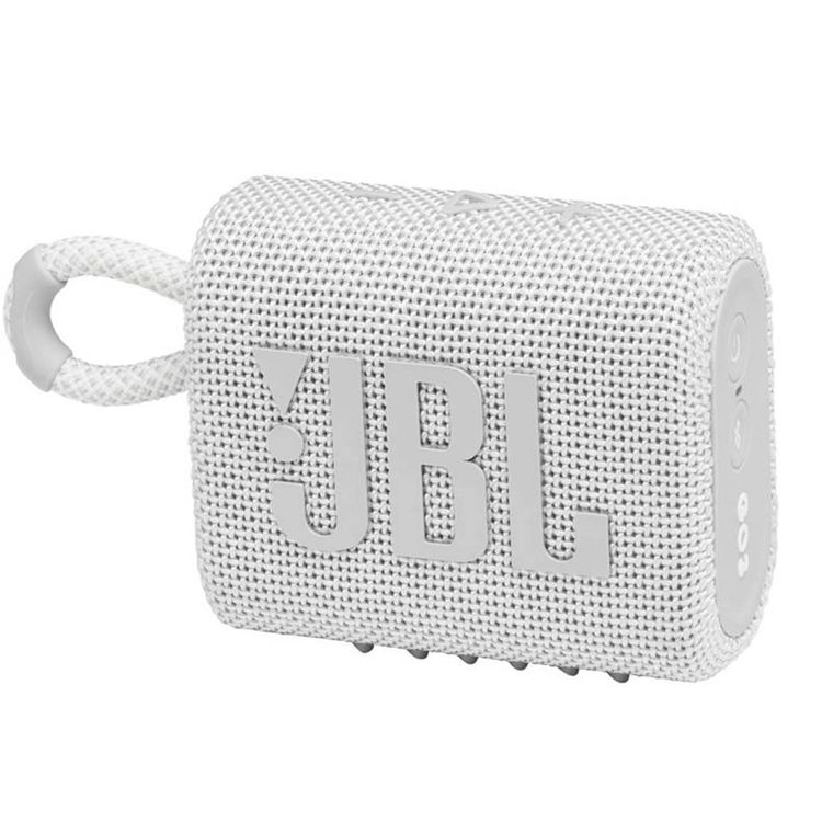 سماعة JBL Go 3 بتقنية البلوتوث مع مدة تشغيل تصل إلى 5 ساعات، وشحن كامل خلال 2.5 ساعة، مضادة للماء والغبار، بقدرة إخراج 4.2 واط، تصميم محمول وخفيف الوزن، صوت JBL الاحترافي - لون أبيض