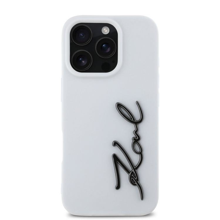 جراب كارل لاجرفيلد المصنوع من السيليكون مع شعار معدني مميز لهاتف iPhone 16 Pro، حماية من السقوط، سهل التركيب، قبضة مريحة - أبيض
