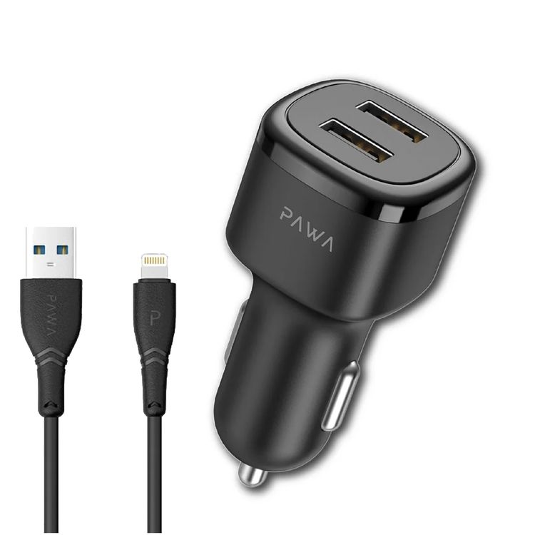 شاحن سيارة باوا متين بمنفذ USB مزدوج 2.4 أمبير مع كابل لايتنينج - أسود
