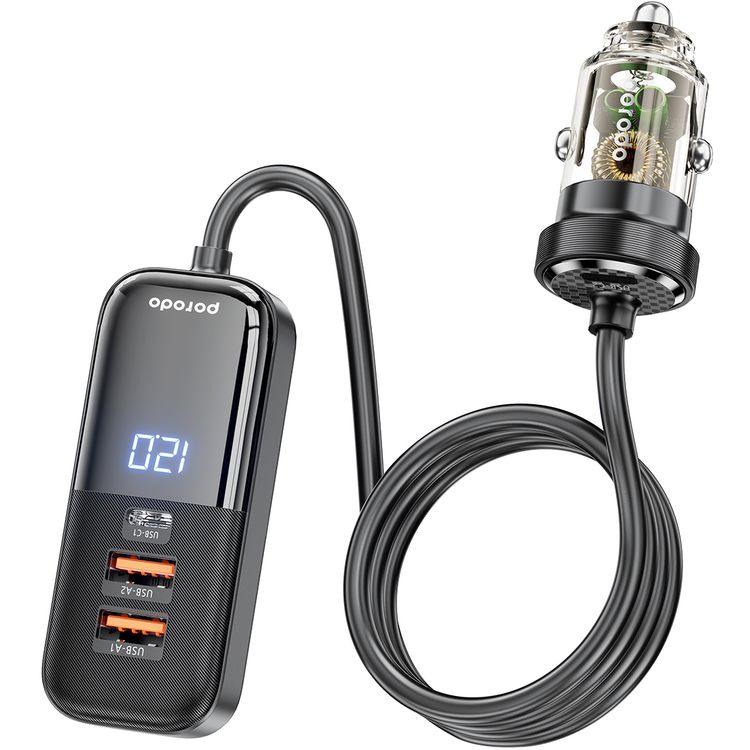 شاحن سيارة شفاف متعدد المنافذ من بورودو بقوة 120 وات مع منفذي USB-C وUSB-A، ومحور شحن سريع، مصنوع من سبائك الألومنيوم ومواد الكمبيوتر، بطول كابل 1.5 متر، متوافق عالميًا، شحن متزامن، شاشة رقمية - أسود