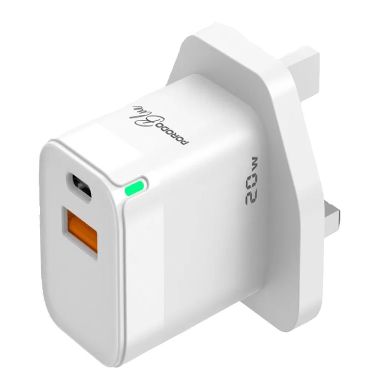 شاحن بورودو بلو فائق السرعة، USB-A وUSB-C، 20 وات، تيار خرج 3 أمبير، جهد خرج 5 فولت، شحن أجهزة متعددة، دعم الشحن السريع، حماية من الشحن الزائد، حماية من الحرارة الزائدة - أبيض