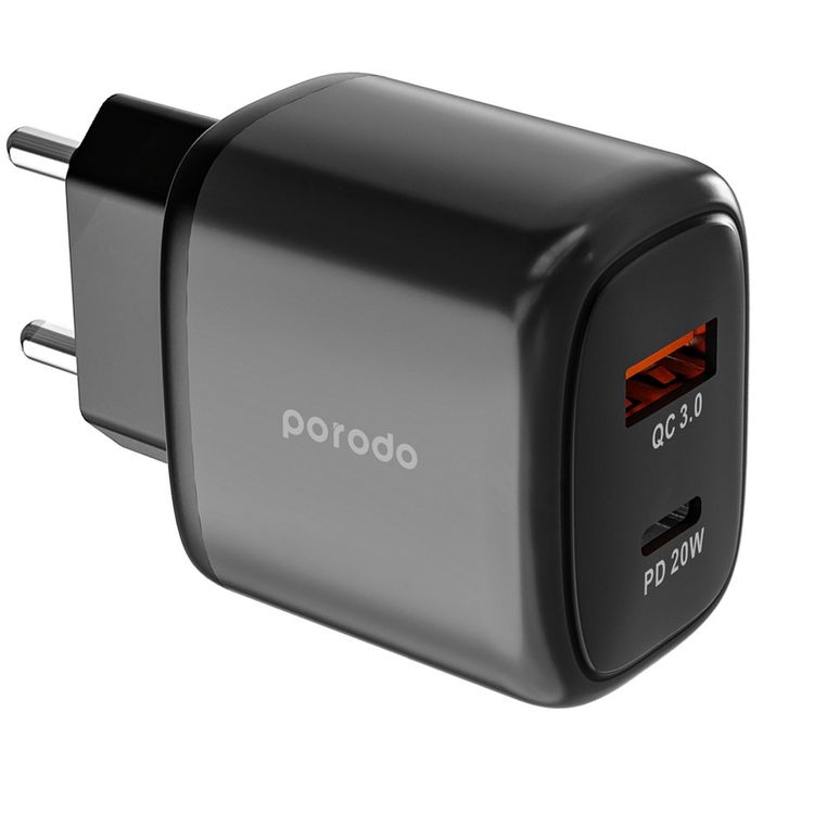 شاحن سريع مزدوج الإخراج من Porodo EU USB-C PD وUSB-A QC - أسود