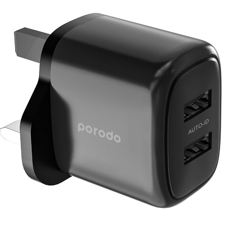 شاحن Porodo المزدوج USB السريع مع تقنية الهوية التلقائية - أسود