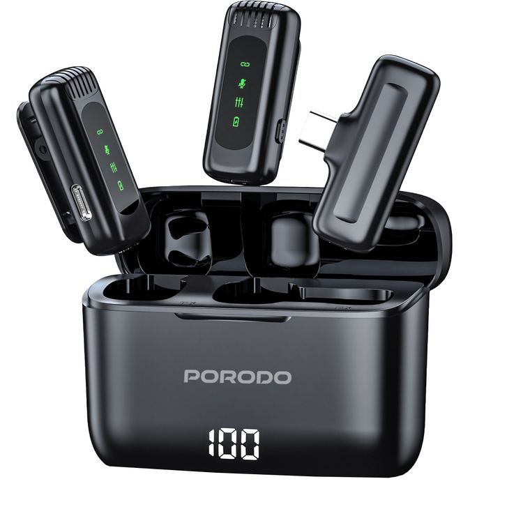 ميكروفون لافاليير مزدوج من بورودو مع علبة شحن، 4 ساعات عمل، ساعة واحدة من وقت إعادة شحن الميكروفون، سعة بطارية العلبة 300 مللي أمبير - أسود