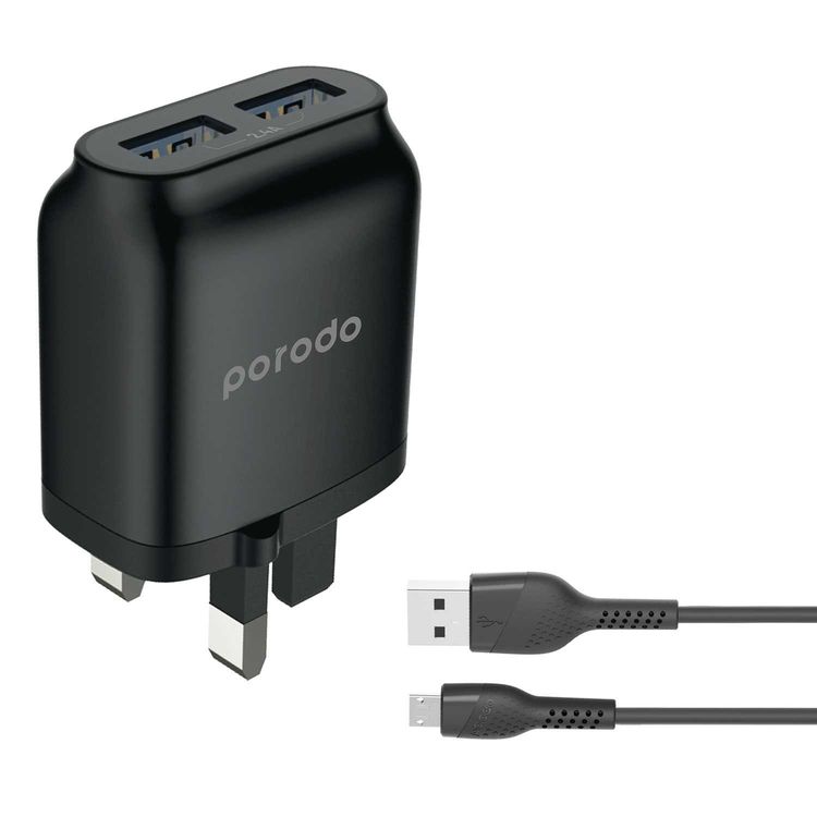 شاحن بورودو الرئيسي، شاحن حائط مزدوج USB بقوة 2.4A مع كابل ميكرو USB محسن بطول 1.2 متر متوافق مع الأجهزة الميكرو، قابس 3 سنون للمملكة المتحدة، حماية من السخونة الزائدة - أسود