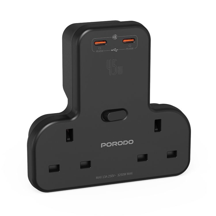 بورودو مقبس جداري متعدد المنافذ مع مخرجي Type-C، شحن متزامن، توصيل طاقة 45 واط، خفيف الوزن ومحمول، طاقة 3250 واط - أسود
