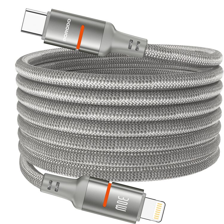 Porodo كابل من نوع Type-C إلى Lightning مغناطيسي مجدول مع توصيل طاقة بقوة 30 واط، بطول 1.2 متر، عمر افتراضي لأكثر من 15,000 انحناء، تصميم خالي من التشابك - رمادي