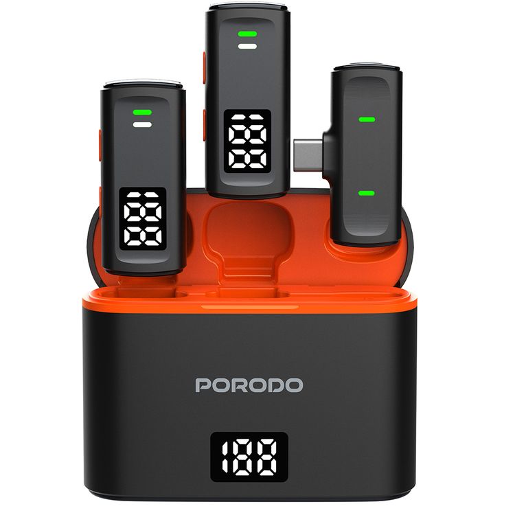 يُعد ميكروفون Porodo اللاسلكي المزدوج المزود بحافظة شحن ومحول Lightning الحل الصوتي المثالي لتسجيل صوت واضح واحترافي. يحتوي نظام الميكروفون اللاسلكي هذا على بطارية 600 مللي أمبير في الساعة. يوفر ما يصل إلى 16 ساعة من الاستخدام بشحنتين فقط، لذا فهو مثالي لجلسات التسجيل الطويلة . تتمتع الميكروفونات بزمن انتقال منخفض وتأخير 20 مللي ثانية وتضمن مزامنة صوتية في الوقت الفعلي. يضمن تردد 2.4 جيجا هرتز اتصالاً مستقرًا. بفضل تصميم التوصيل والتشغيل البسيط، يسهل إعداده واستخدامه. إنه مثالي لمنشئي المحتوى ومقدمي البث الصوتي والمحترفين النشطين. تعرض الشاشة الرقمية معلومات البطارية والاتصال في الوقت الفعلي. يوفر كل ميكروفون ما يصل إلى 7 ساعات من وقت العمل المستمر، ويتم إعادة شحن العلبة بالكامل في غضون 1.5 ساعة فقط. يعمل ميكروفون Porodo اللاسلكي المزدوج المزود بحافظة شحن ومحول Lightning مع العديد من الأجهزة ويضمن المرونة والراحة.