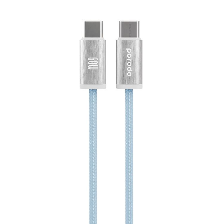 كابل Porodo المنسوج من USB-C إلى USB-C للشحن ونقل البيانات، هيكل من الألومنيوم، توصيل طاقة 60 وات، مكونات عالية الجودة، شحن سريع، خالي من التشابك، أكثر من 15000 انحناء، طول الكابل 1.2 متر - أزرق