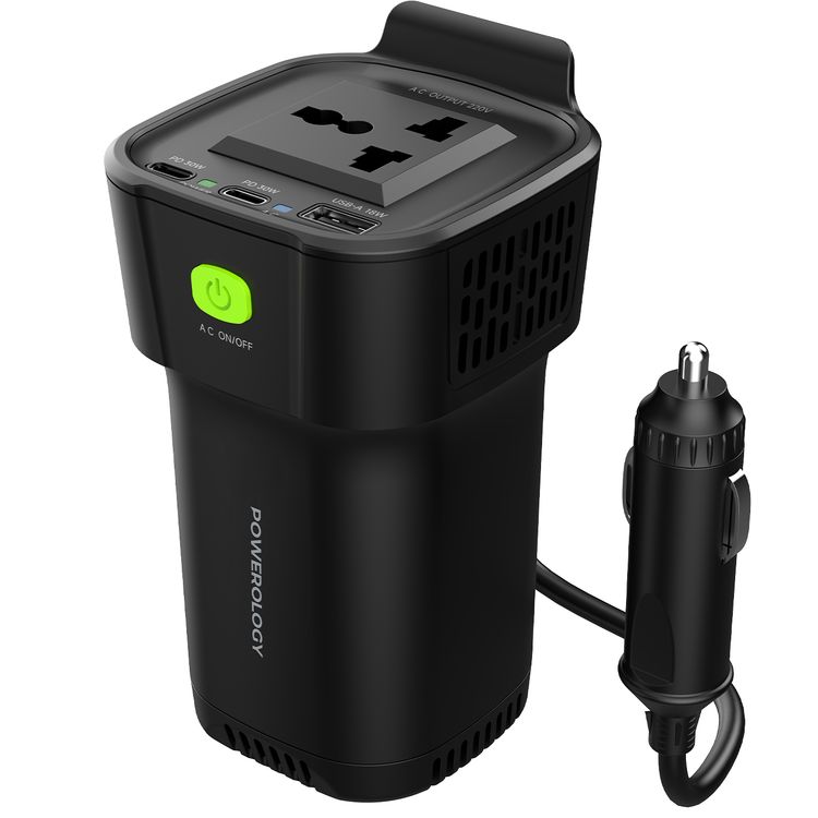 حامل أكواب باورولوجي 150 واط، محول طاقة مزدوج USB-C وUSB-A QC3.0 - أسود