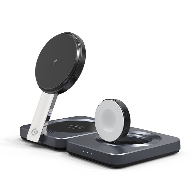 شاحن لاسلكي مغناطيسي قابل للطي 3 في 1 من باورولوجي مع نظام تبريد نشط، شحن أجهزة متعددة، شحن بقوة 15 وات، واجهة إدخال من النوع C - أسود