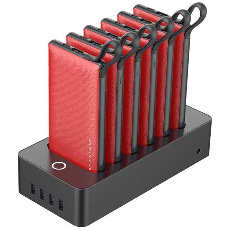 محطة باور بانك 6 في 1 من باورولوجي 10000 مللي أمبير في الساعة مع كابل مدمج، بنك طاقة محمول، محطة شحن سريعة، منافذ شحن من النوع C - أحمر