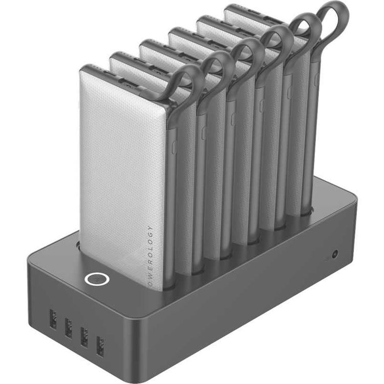 باورولوجي محطة باور بانك 6 في 1 بسعة 10000 مللي أمبير في الساعة مع كابل مدمج وبنك طاقة محمول وجهاز ايفون متوافق مع محطة شحن سريعة ، وأجهزة اتدرويد ، ومنافذ شحن من النوع C - أبيض