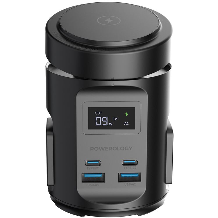 موزع طاقة Powerology Magsafe مع قابس PD 65 UK وات، USB-A QC 3.0، حماية مدمجة، شحن لاسلكي 15 وات، طاقة مقدرة 2200 وات - أسود