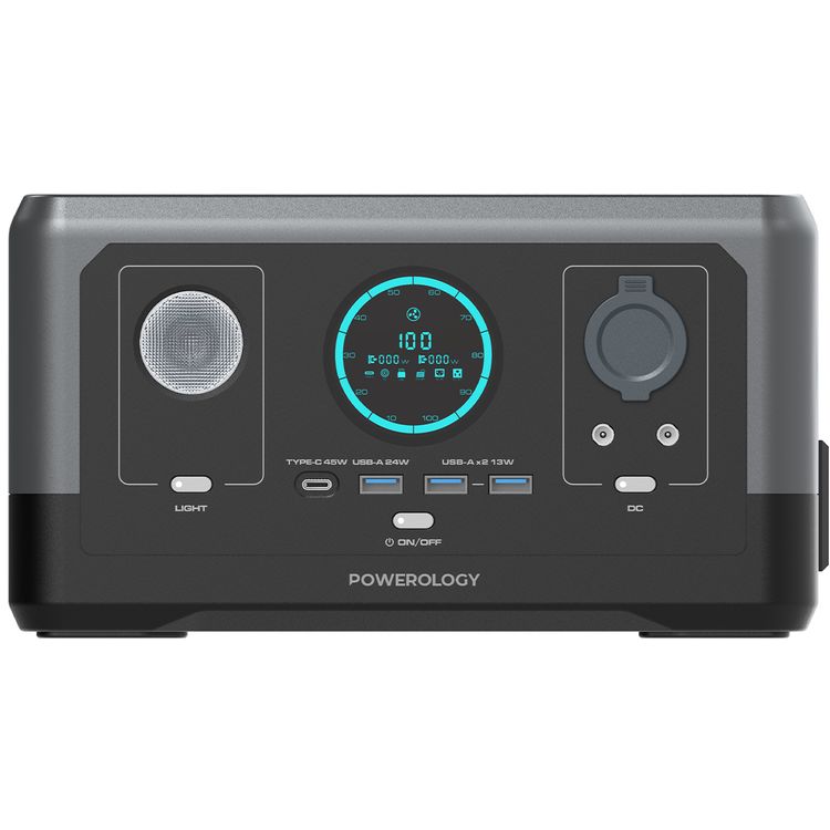 مولد طاقة محمول Powerology 76800mAh 300W يعمل بالطاقة الشمسية، 45W PD، 100W مدخل طاقة شمسية، مخرج شاحن لاسلكي 15W، مخرج طاقة للسيارة 8A - أسود