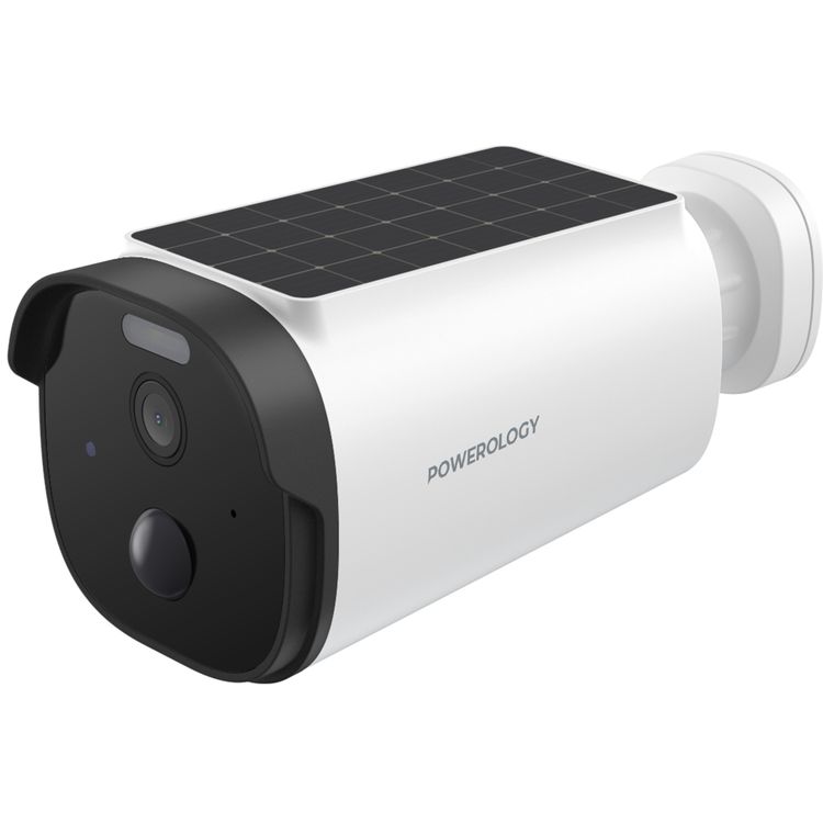 كاميرا Powerology مدمجة تعمل بالطاقة الشمسية في الهواء الطلق، سعة بطارية 5200 مللي أمبير في الساعة، نطاق PIR من 3 إلى 9 أمتار، دقة 2304 × 1269 بكسل، لوحة شمسية 1.5 وات - أبيض