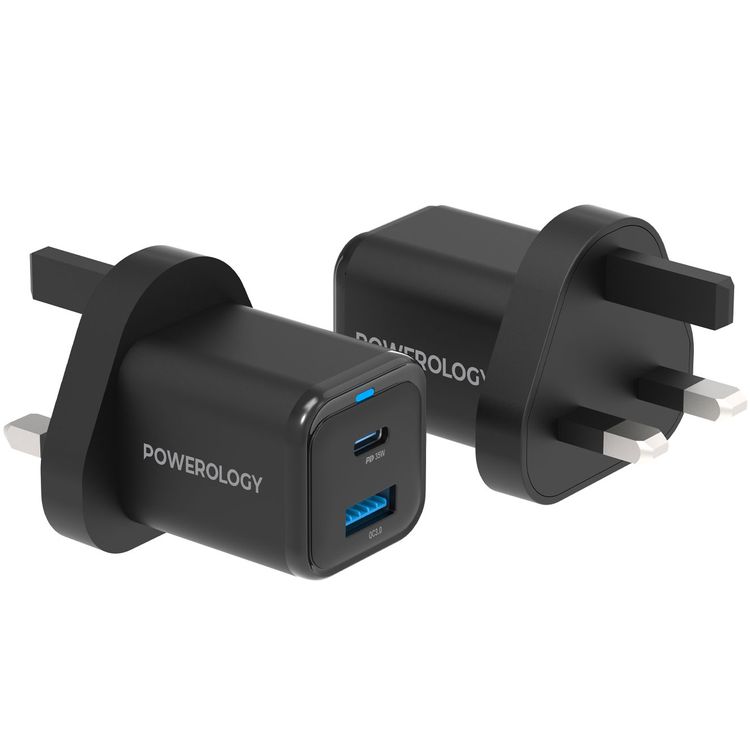 Powerology 35W PD QC 1xUSB-C 35W and 1xUSB-A 18W GaN Charger UK - Black - أسود