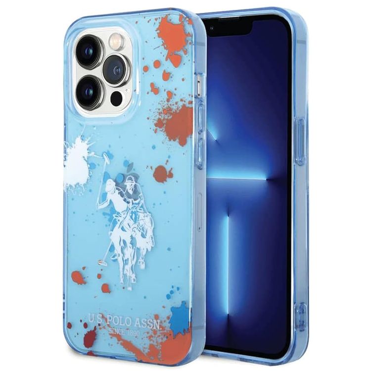 USPA PC/TPU Case with Splatter Pattern & Horse Logo iPhone 14 Pro Max Compatibility - Blue