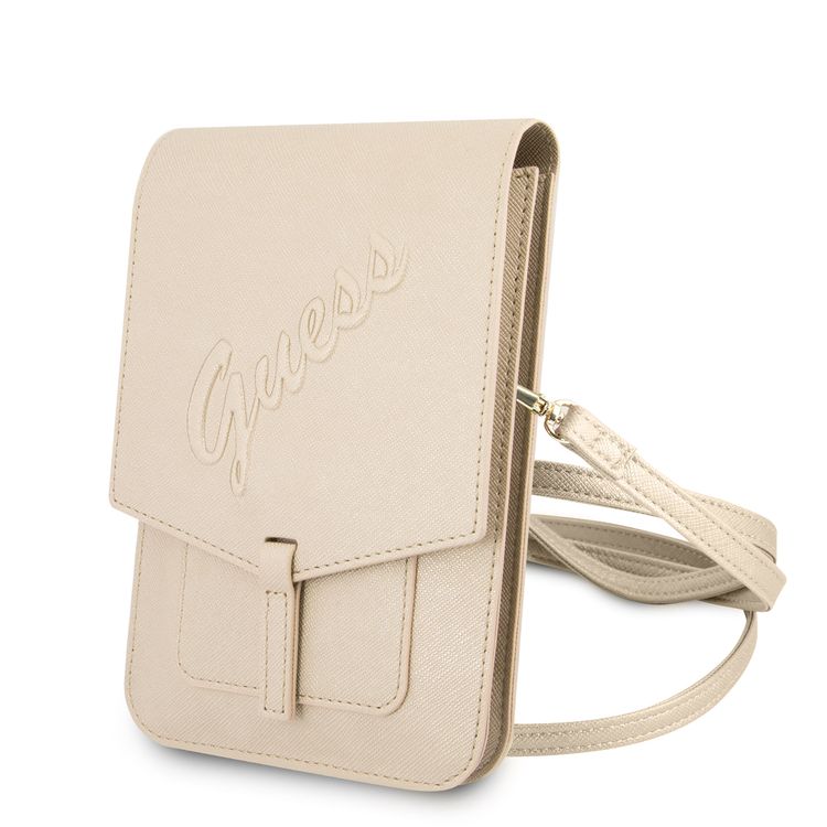 CG MOBILE Guess PU Saffiano Script Crossbody Wallet Bag with Adjustable Shoulder Strap, Portable Phone Storage Bag Suitable for Outdoor, Business, Office, School Gold