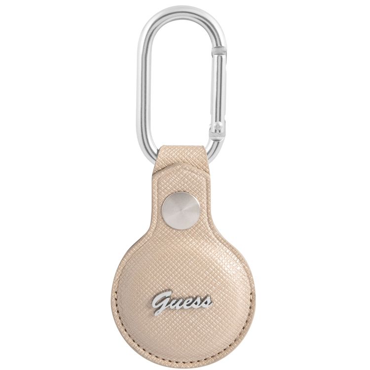 CG MOBILE Guess Saffiano PU Script Logo Case with Dog Clip for Airtag, Portable Protective Skin Cover, Anti-Lost Holder with Keychain Officially Licensed - Beige