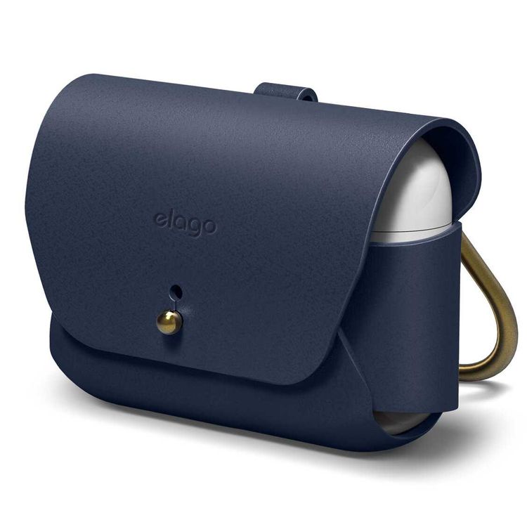 Elago Genuine Leather Case Compatible w/ Apple Airpods Pro, Vintage Design, Supports Wireless Charging, Brass Ring Holder, Anti-Slip, Shock Proof, Bring as Keychain - Jean Indigo