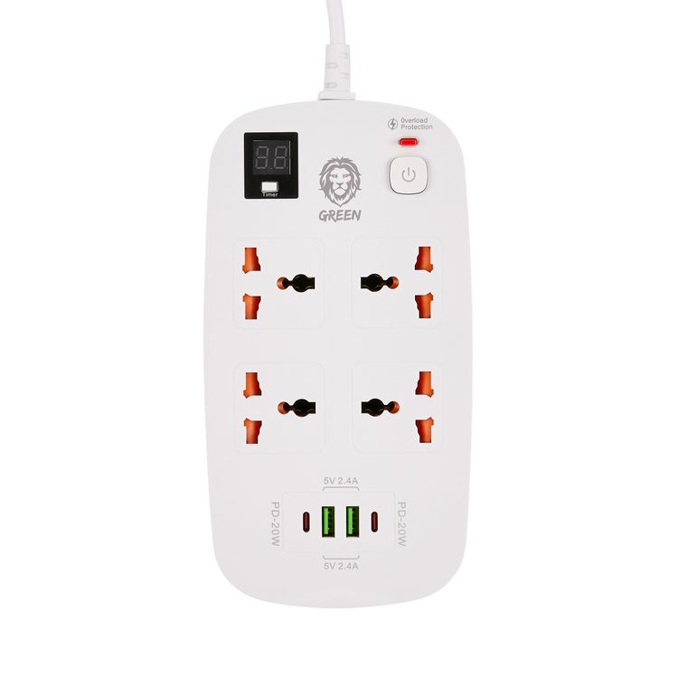 Green Lion Multiport Smart Power Socket, 4 AC Sockets, 2 USB-A & 2 USB-C Ports, 1-24 Hours Timer Function, Over Voltage, Over Current & Over Heat Protection, Power Surge Protection - White