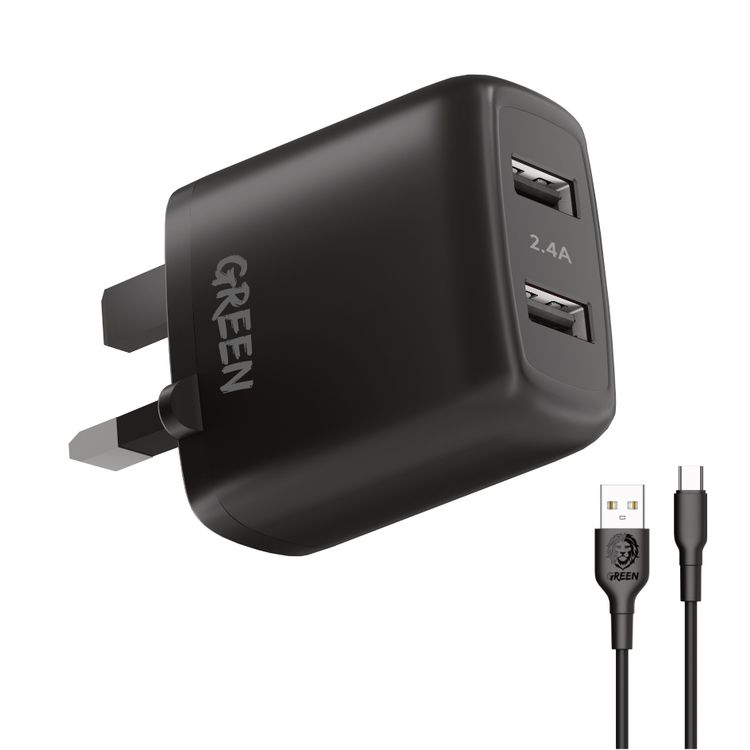 Green Lion Charger Dual USB Port Wall Charger 12W UK with PVC Type-C Cable - Black