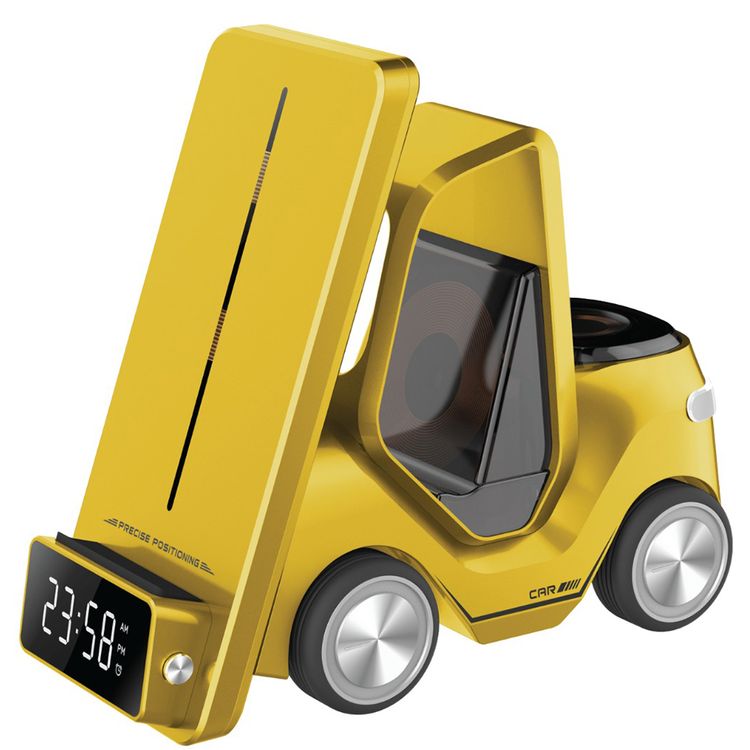 Green Lion Forklift 5 in 1 Wireless Charger, Night Light, Digital Clock, Earpod Charger 5W/Smart Watch 2.5W/Smart Phone 15W - Yellow