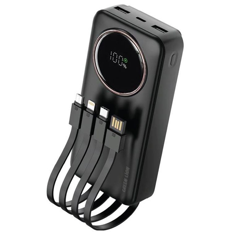 Green Lion Power Pulse 20000mAh Power Bank, PD 22.5W, Portable, Digital Display, Fast Charge Support, Micro + Lightning + Type-C + USB-A Integrated Cables - Black