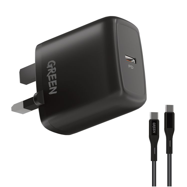 Green Lion Type-C Port Wall Charger 20W UK with PVC Type-C to Type-C Cable 1.2M, Fast Charge Adapter & Cable with Over-heat Protection - Black