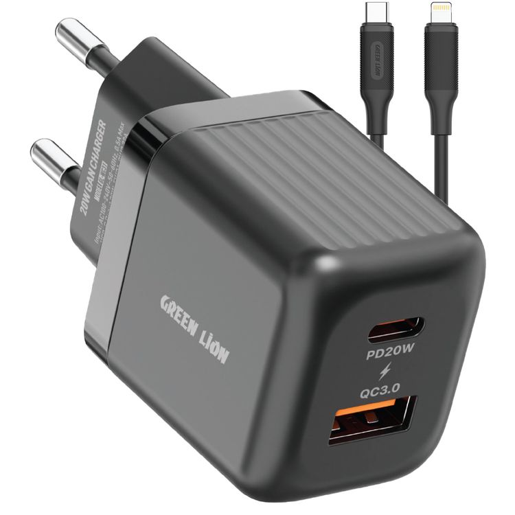 Green Lion Ultra Compact GaN Wall Charger with Dual USB-C & USB-A Ports and USB-C to Lightning Cable, PC Flame Retardant Material, Fast Charging Support, Charging Protection, Universal Compatibility, Ultra Portable - Black