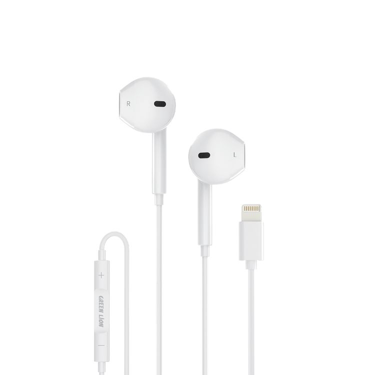 Green Lion Wired Stereo Earphones with Lightning Connector, Stereo Sound, Control Buttons, 1.2m Cable Length, TPE & Copper Wire Material, 14.2mm Speaker Size - White
