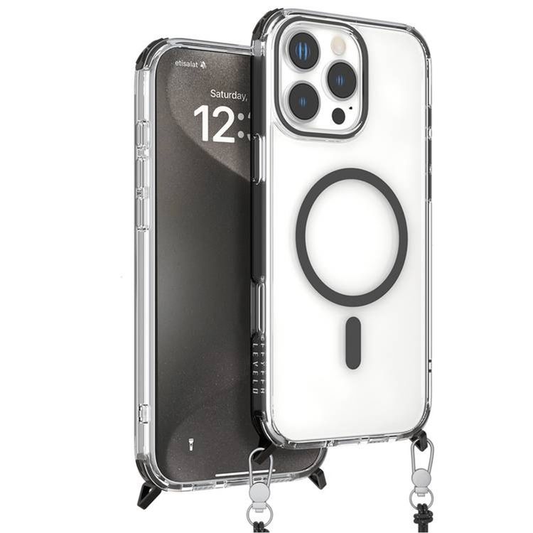 Levelo Celeste MagSafe Case with Crossbody Strap for iPhone 16 Pro, AirGuard Technology, Metal Hook, Durable Material - Black