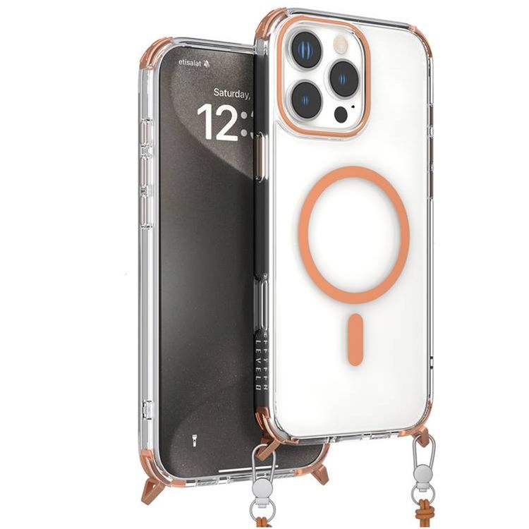 Levelo Celeste MagSafe Case with Crossbody Strap for iPhone 16 Pro Max, AirGuard Technology, Metal Hook, Durable Material - Orange