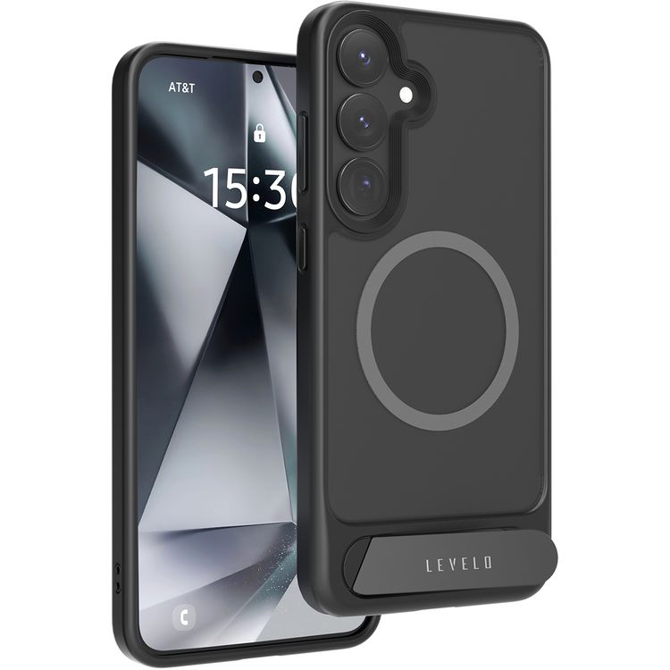 Levelo Matteo Case with Built-in Kickstand for Samsung Galaxy S25 Plus, Impact-Resistant Corners, MagSafe Compatible, Anti-Fingerprint, TPU & PC Material - Black
