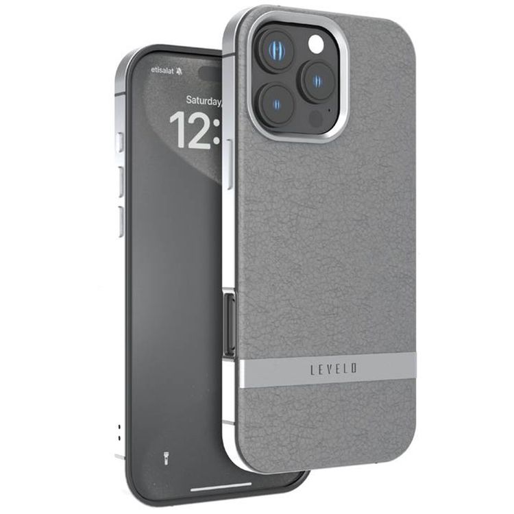 Levelo Pelle Leather Case for iPhone 16 Pro Max with Aluminum Bumper, Impact Resistant Corners, MagSafe compatibility, Lightweight & Slim Profile - Gray