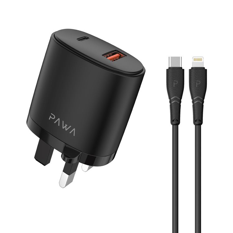Pawa Solid Travel Charger Dual PD & QC Port With Type-C to Lightning Cable-Black