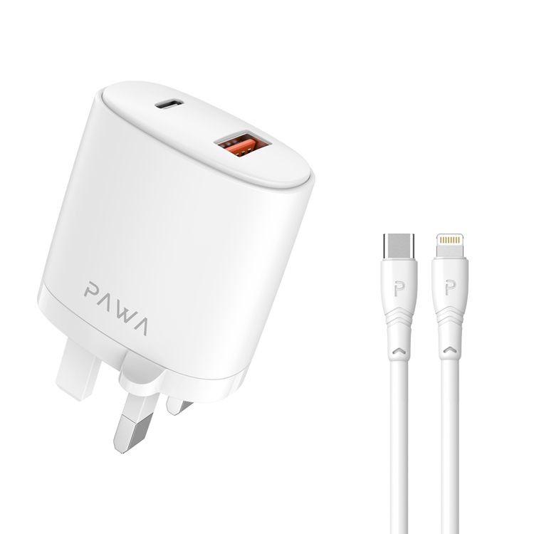 Pawa Solid Travel Charger Dual PD & QC Port With Type-C to Lightning Cable-White
