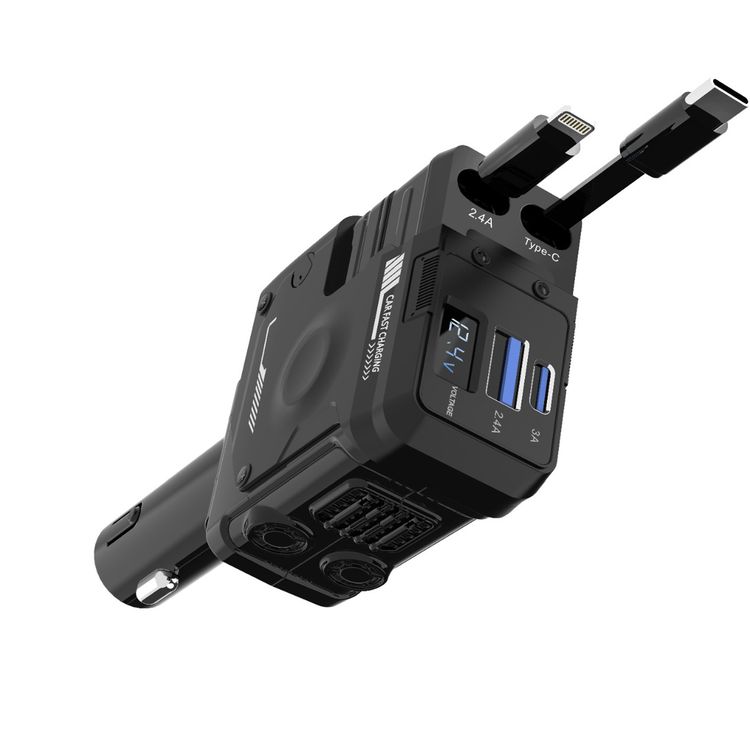 Porodo 66W Car Charger with Lightning & Type-C Wires, PD 36W, Universal Compatibility, Simultaneous Charging, 80cm Cable Length - Black